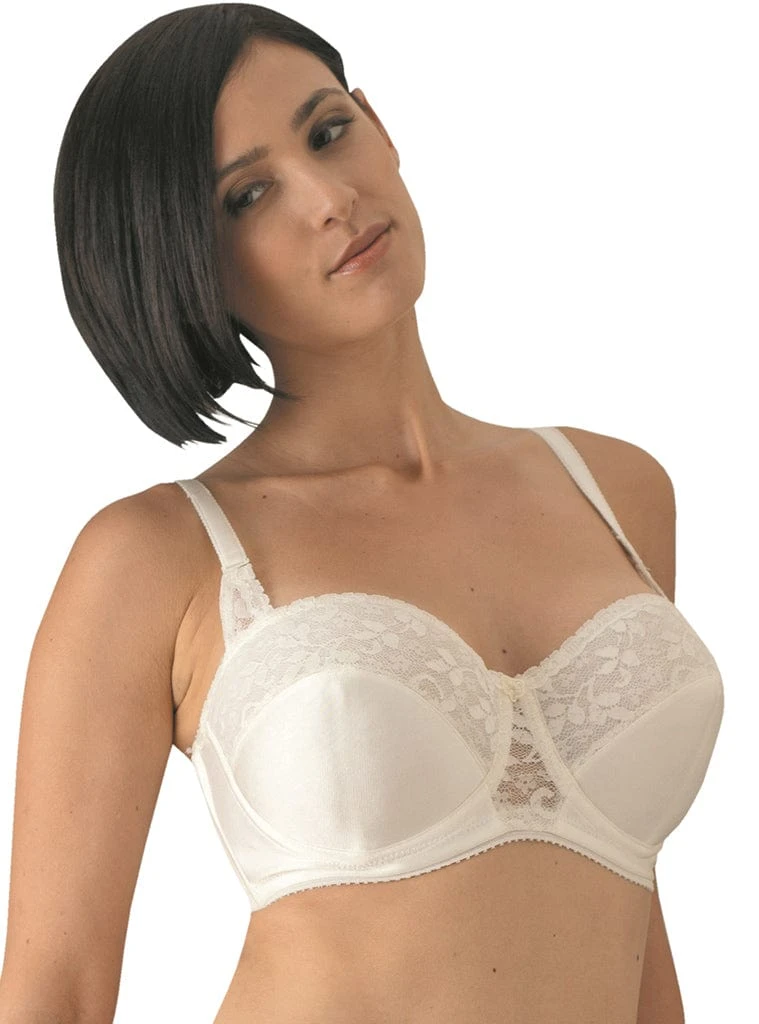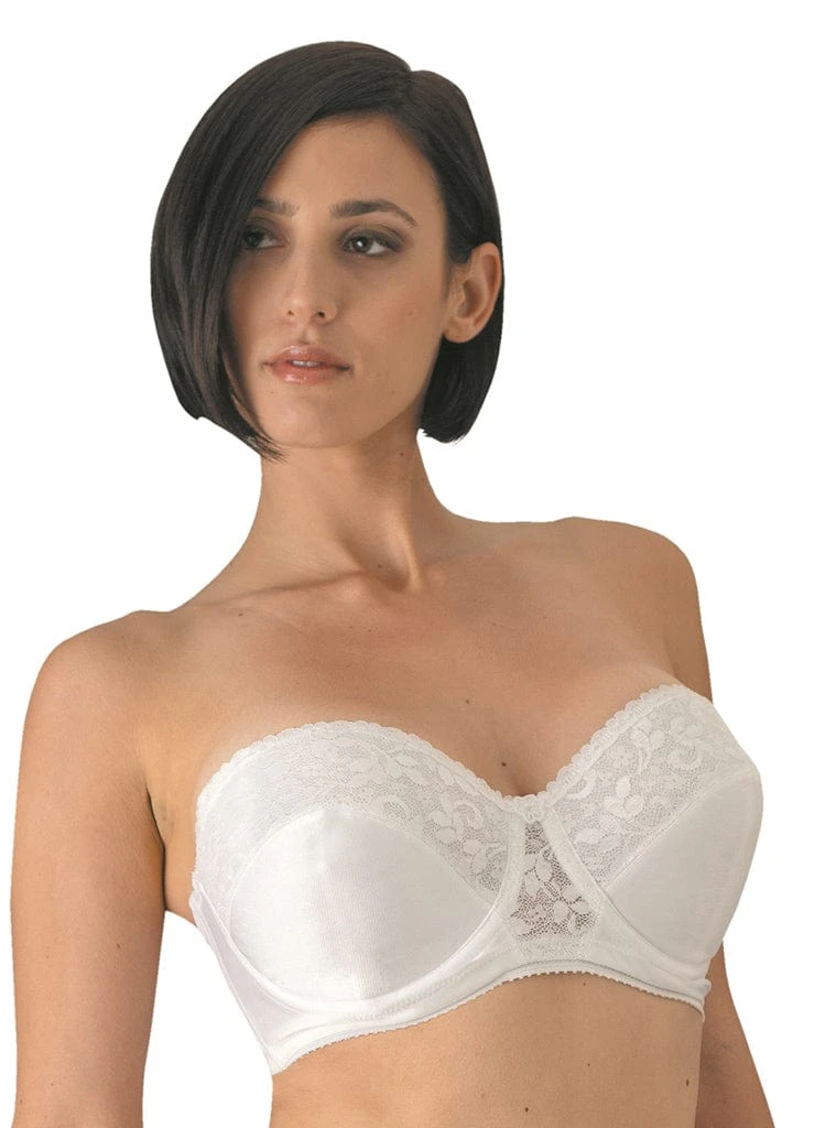 Dual section fiberfill lined cups made of exquisitely detailed lace and double knit nylon provide the ultimate in full figure support. Our famous hidden gripper elastic will keep this full coverage invisible strapless from slipping or riding up. Sizes 44B & C, 44-48DD and 32-48DDD may also be worn conventional, crisscross, and halter (Removable straps included for the above sizes).