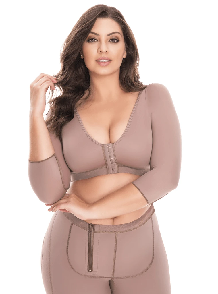 Postoperative push-up bra made with an elastic fabric compression provides coverage to back and arms and centers the bust.