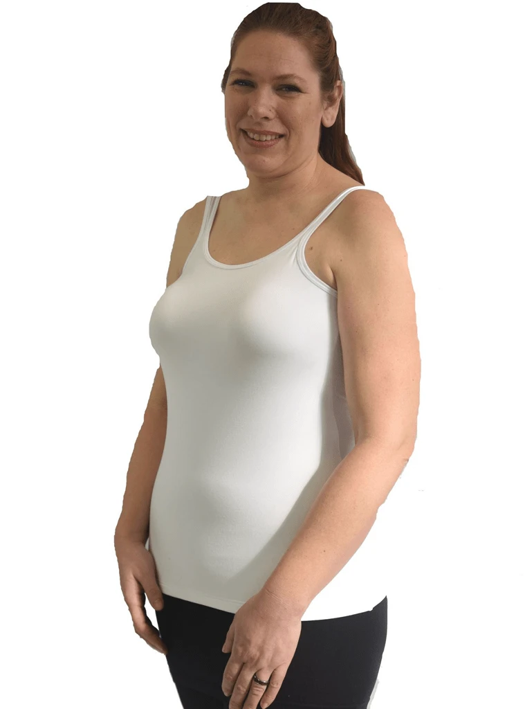 Modest mastectomy camisole or tank top all-inclusive with built-in lightweight breast prostheses, so no need to purchase additional breast forms. No shelf bra or heavy elastics across the chest, just smooth fabric against mastectomy scars. No visible seams across the front. Adjustable straps for perfect placement. Super soft, moisture wicking, heather moss jersey fabric comfortable for everyday wear. An entire garment with built-in prosthetics weighs between 8 ounces and 12 ounces, depending on size.