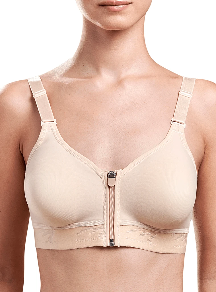 Marena’s new FlexFit ™ Ultra-Low Coverage features front-close, detachable straps for clinical viewing and easy donning following breast augmentation procedures. Marena’s zipper-lock front closure prevents the garment from accidentally sliding open during everyday activities. Engineered with Marena’s FlexFit™ Cup that integrates two cup sizes into one bra and accommodates breast volume variation due to swelling, this bra also features a microfiber 3-row hook-&-eye back closure for full adjustability. Marena’s patented TriFlex™ fabric has superior stretch to prevent binding, provides moisture wicking and cooling, and Silvadur™ antimicrobial protection. Machine washable.