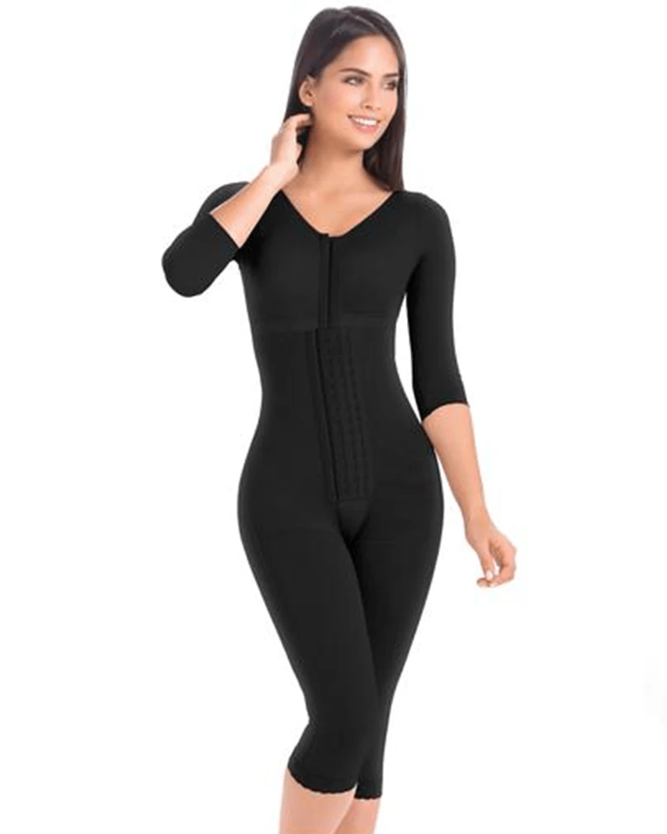 - This full-body bodysuit features 4-level hook-and-eye closure to grade compression.