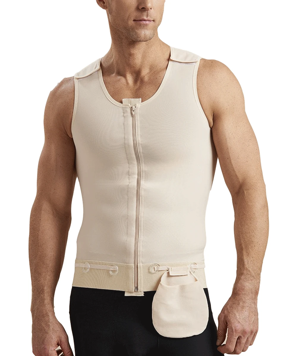 This vest features our patented drain bulb management system with removable loops for drain tubes and pouches for drain bulbs and multiple band positions on front and side for comfortable pouch and drain bulb placement. Drain bulbs not included.