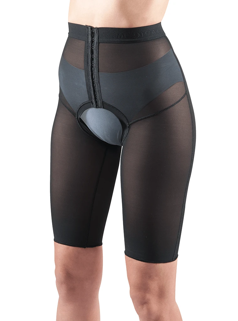 The Standard Short Lipo-Panty® Waist Height is equipped with two rows of hook and eye closure and is open at the crotch.