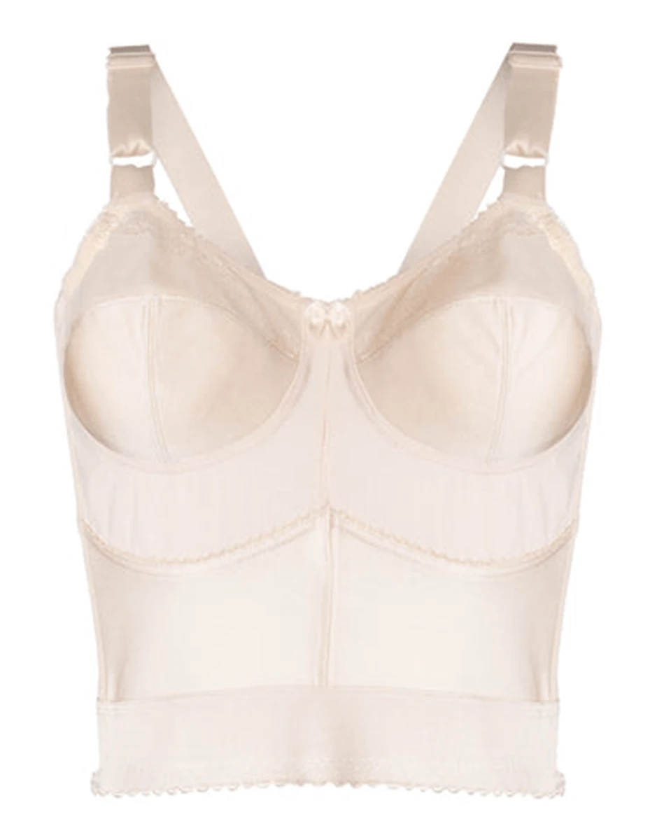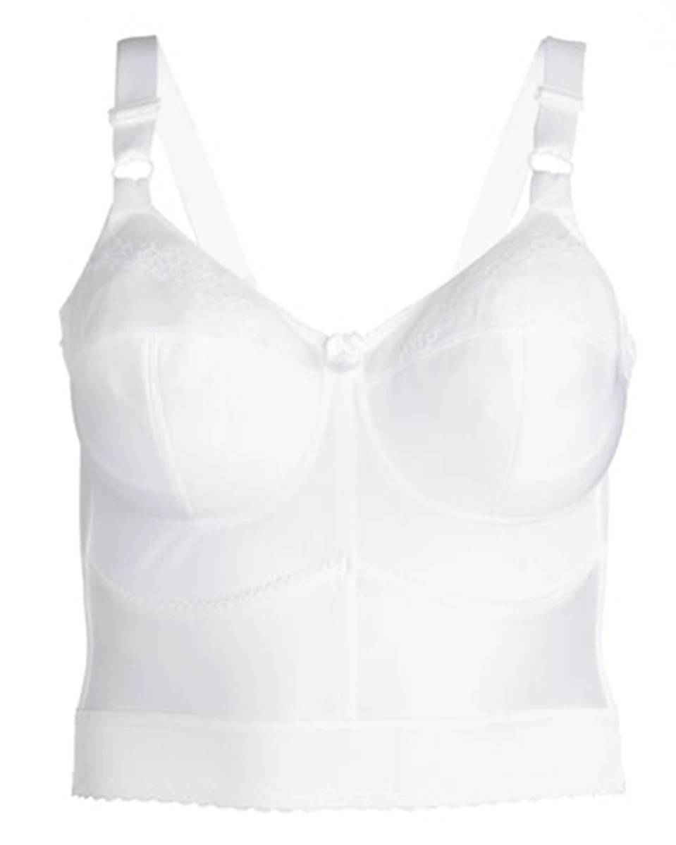 Soft cup long line bra with delicate embroidery and under cup support panels for added lift. Control panels and shaping in the body for midriff shaping. 2” elastic band for stability.