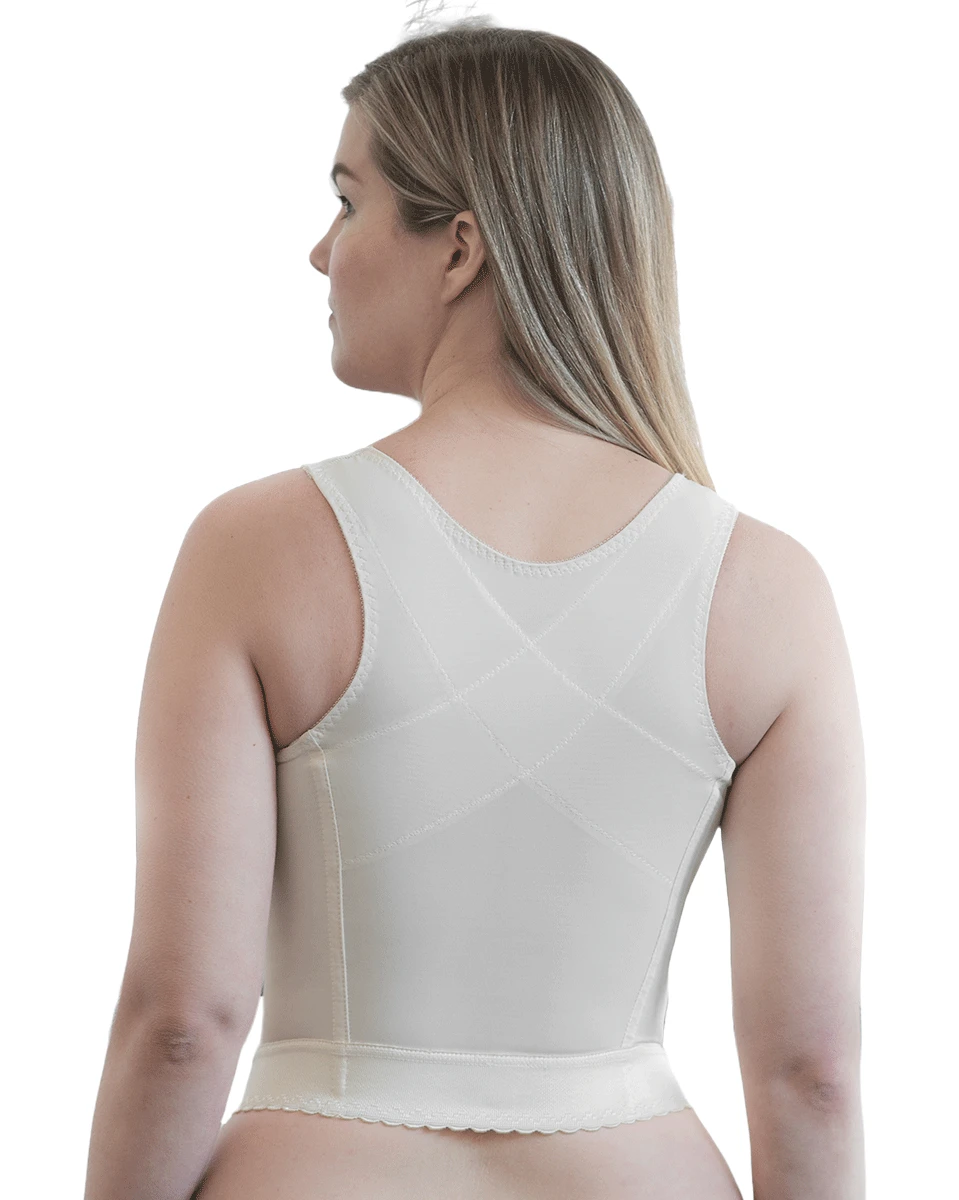 Long Line Bra offering soft cups with front closure. Designed with Special Supportive Bands to promote better posture and relief to upper and lower back. Wide straps to relieve shoulder strain. Wide anchor band for added stability.