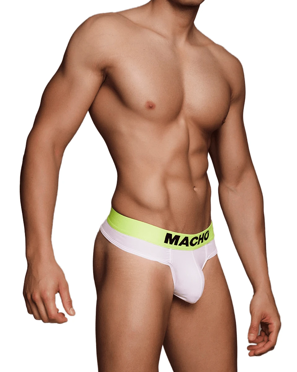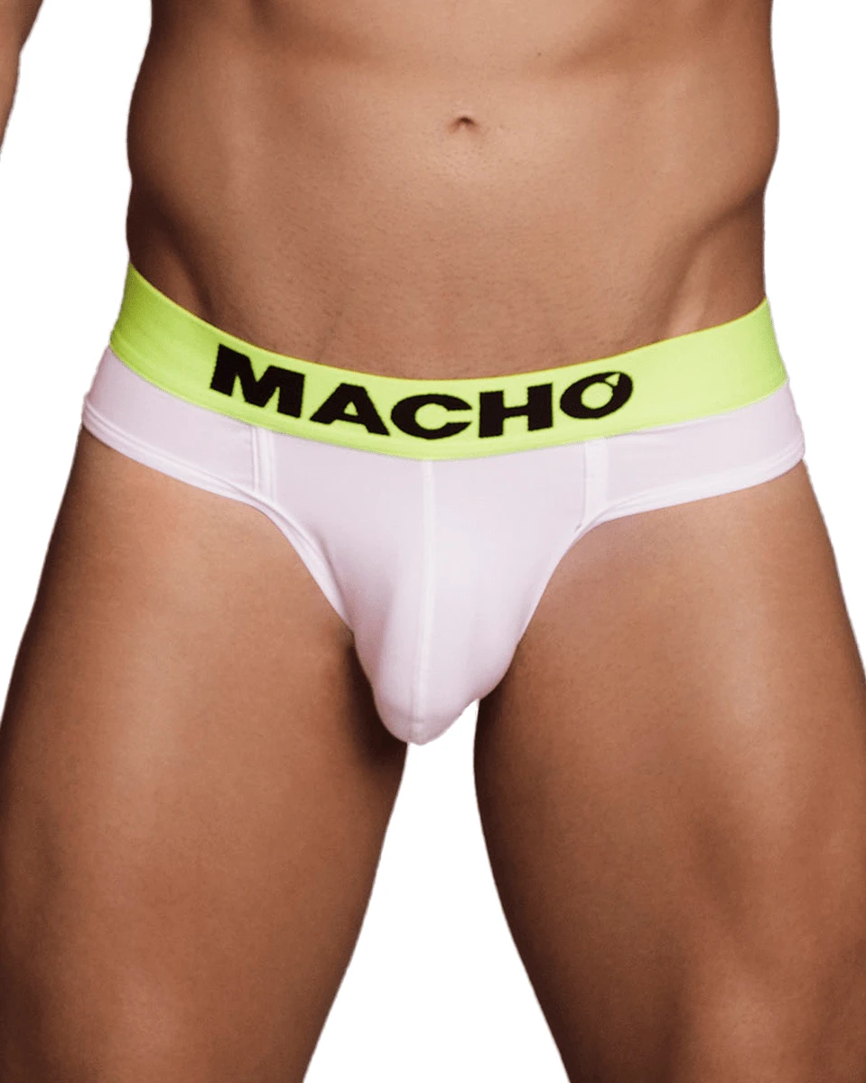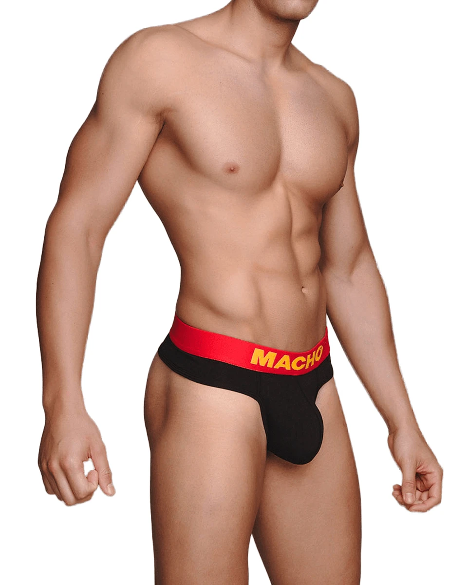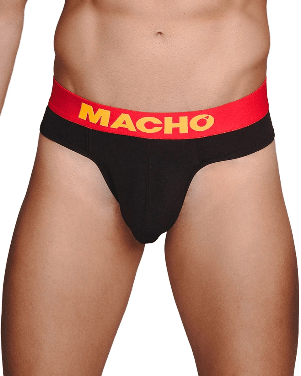 The colors of this white, black and red slip with modern and dynamic contrasts. The white fabric has an electric green elastic and MACHO logo in black, the black fabric has red elastic and the MACHO logo in yellow making a sensual and fiery contrast, and the red fabric has a blue elastic and the logo MACHO in white color making this garment, a very striking garment.