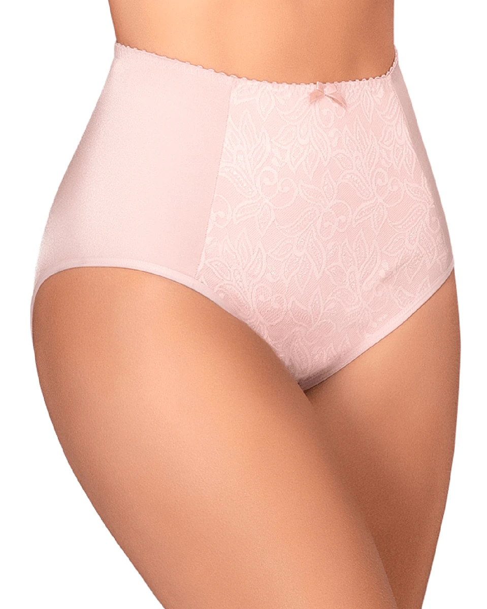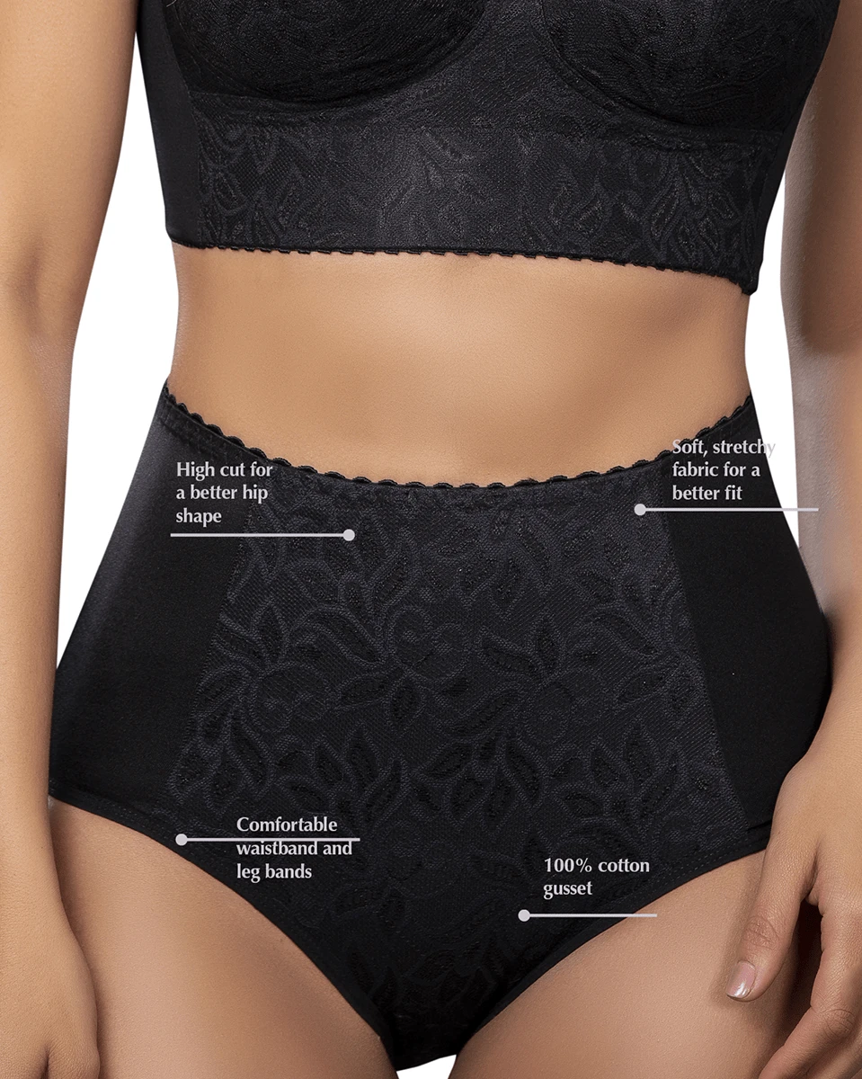 Tummy control panty in lace and spandex. High waisted compression. Full coverage on the sides and in back.